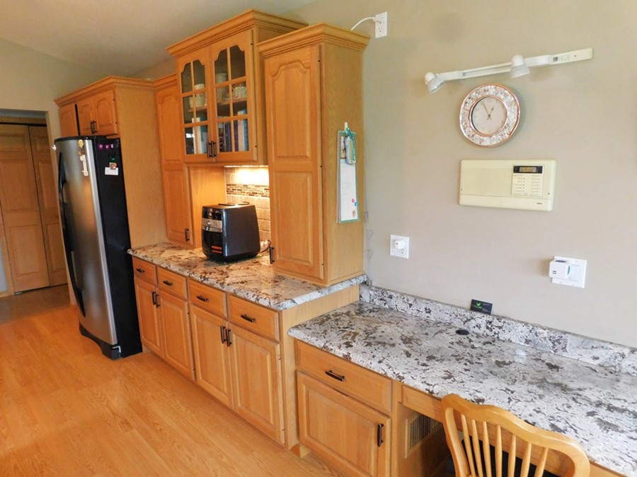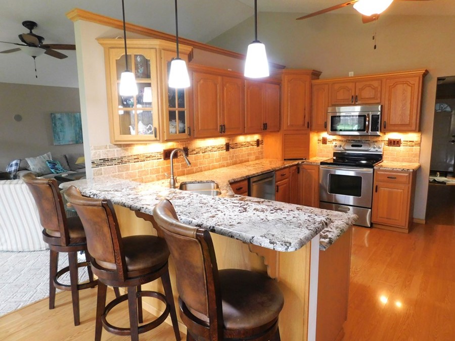 • Kitchen: Wood cabinets, stove, frig, DW , microwave, eating bar
