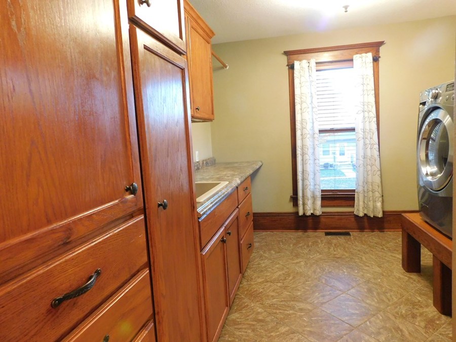 • Kitchen: Wood cabinets, stove, frig, DW , microwave, island